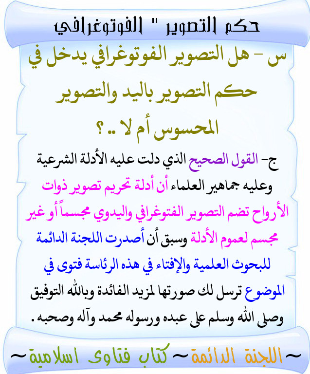 حكم التصوير الفوتوغرافي. اللهم اغفر للمؤمنين والمؤمنات والمسلمين والمسلمات الأحياء منهم والأموات. إن التصوير الفوتوغرافي للإنسان جائز أما التصوير الذي يكون برسم اليد فهو الحرام وما نصيحتكم للأخوات اللاتي يتقدمن للفتوى بغير علم. حكم التصوير الفوتوغرافي لدى جمهور العلماء المعاصرين علمت أن صور ذوات الأرواح حرام وأن أهل الصور والمصورين أشد أهل النار عذابا يوم القيامة ولدي موقع كنت قد وضعت فيه صوري وبعض صور أصدقائي وعندما أردت حذفها نسيت كلمة. حكم التصوير الفوتوغرافي السؤال.